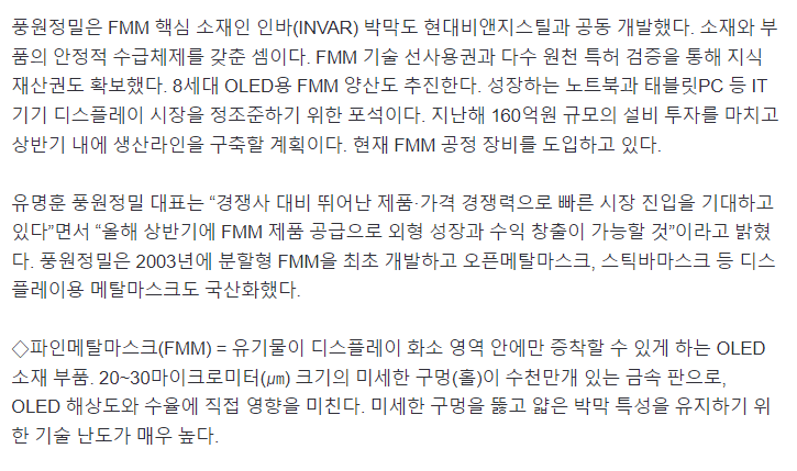 즉, 풍원정밀은 이 파인 메탈 마스크 국산화에 2019년 일본의 수출 규제 이후 자체 개발에 나서서 기존의 에칭 기술을 접목, 올해 1분기 부터 주요 고객사 납품을 시작으로 본격적인 매출 계획이 있으며 예상 매출액은 250억원 2023년에는 562억원이라고 함.