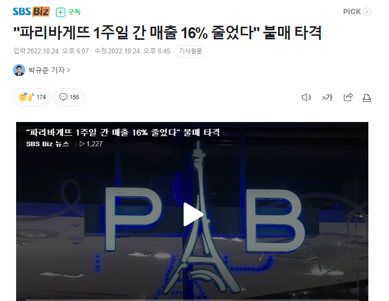 파리바게트의 매출이 유의미한 수준으로 하락하고 있습니다.