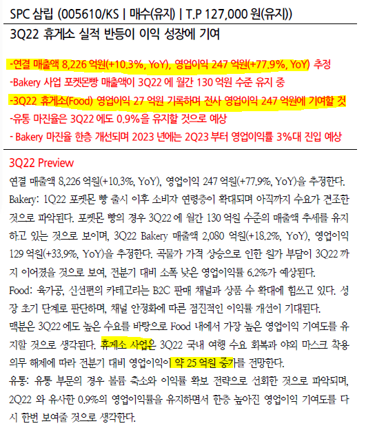 3분기 실적에 영향없음 + 햄버거 프랜차이즈 이야기를 통해 SPC 삼립의 높은 점유율이 부각