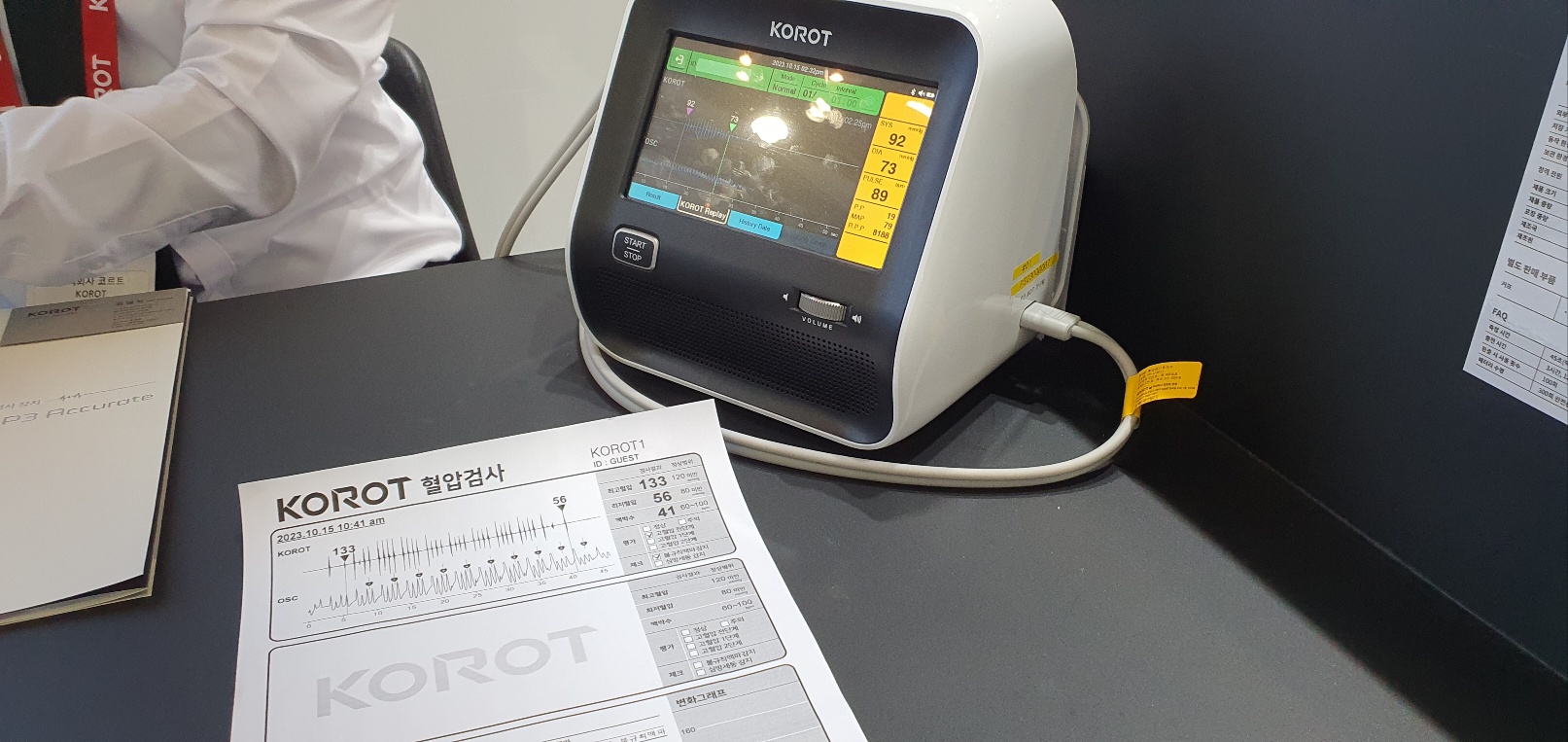 혈압기를 홍보중이었는데 기존 혈압기에 비해 굉장히 작아지고 기기에 청진기를 달아뒀습니다. 의사분들이 청진기를 대고 혈압을 측정하는데 피로감을 느낀다는 것에 아이디어를 얻은거 같더군요. 측정이 끝날때쯤에는 기계에서 제 심장 소리를 직접 들을 수 있었고 일반 혈압기와 다르게 부정맥 여부도 기계에서 체크할 수 있다는 점이 좋았습니다. (저도 내심 궁금했던 부분이었는데) 실제로 체험하신 분들 중에 혈압은 정상이어서 별 소견이 없는 줄 알았다가 이 기기에서 부정맥 소견이 나왔다는 분이 있었는데 회사도 덕분에 홍보도 잘하고 그 분도 바로 진단을 받을 수 있었겠지요.