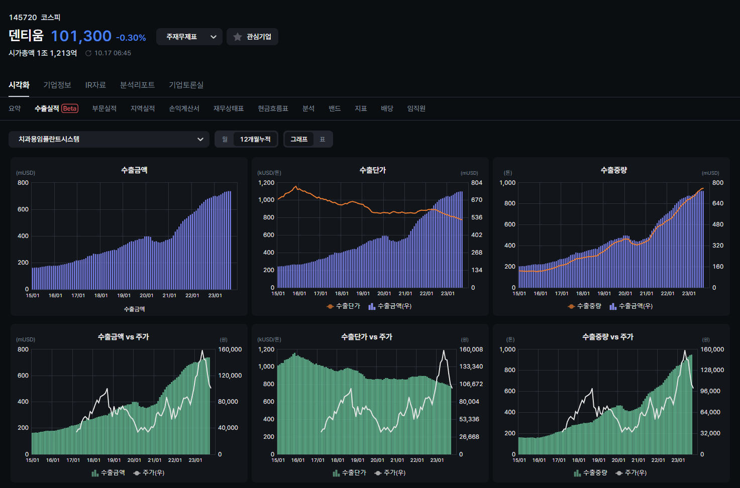 덴티움 같은 종목은 해외 매출의 비중이 크죠. 특히나 성장하는 산업에서 두각을 나타내는 종목들은 수출 데이터로 미리 알 수 있습니다. 일일이 매달 나오는 데이터를 찾아서 보는 수고를 덜어줄 수 있어서 얼마나 고마운지 모르겠습니다.