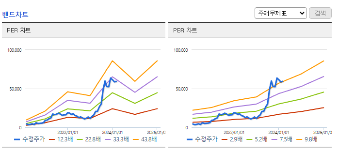 저평가와 고평가의 기준을 보는데 있어 밴드 차트의 활용도 중요한데, 이렇게 밴드 하단에 주가가 형성되어 있으면 저평가, 밴드 상단에 있으면 고평가로 분류한다. 한미반도체의 경우 HBM이 시장에서 부각되기 전까지만 해도 P/E밴드, P/B 밴드 모두 하단을 깰 정도로 저평가 구간이었다가 양쪽다 상단에 위치할 정도로 주가가 많이 올랐다.