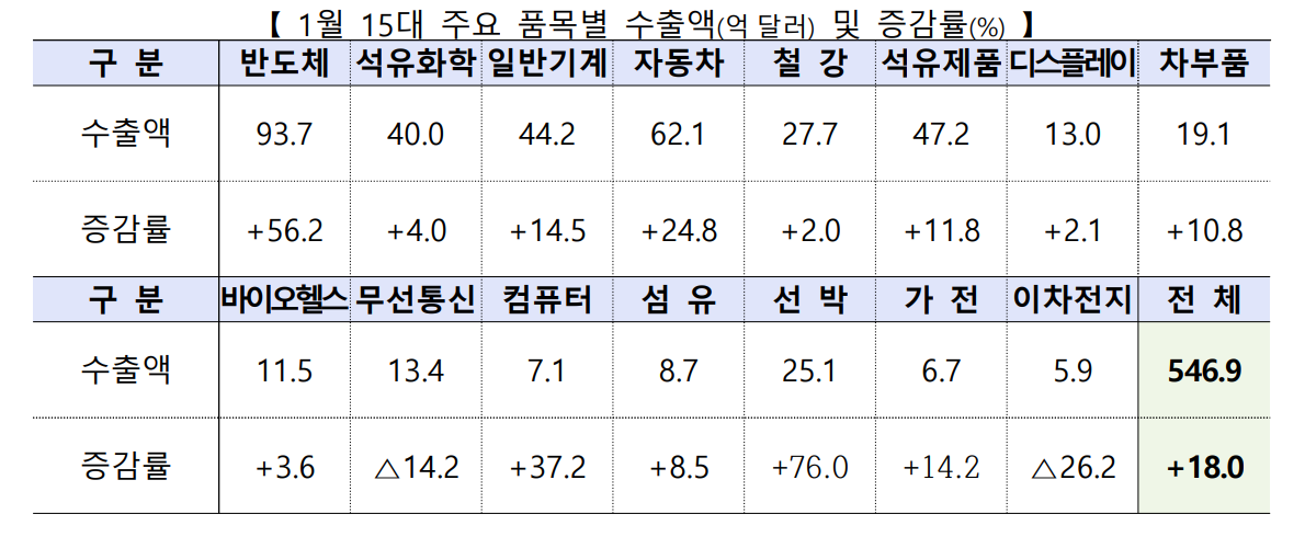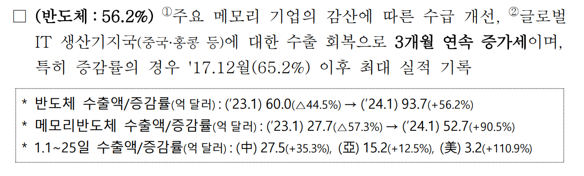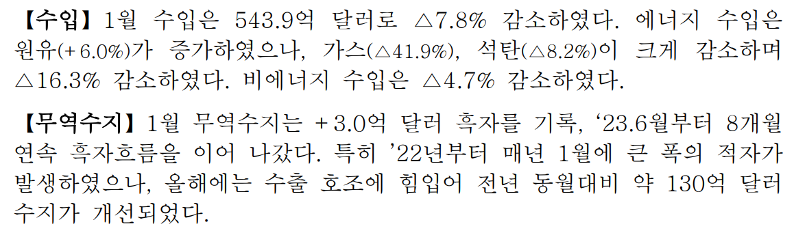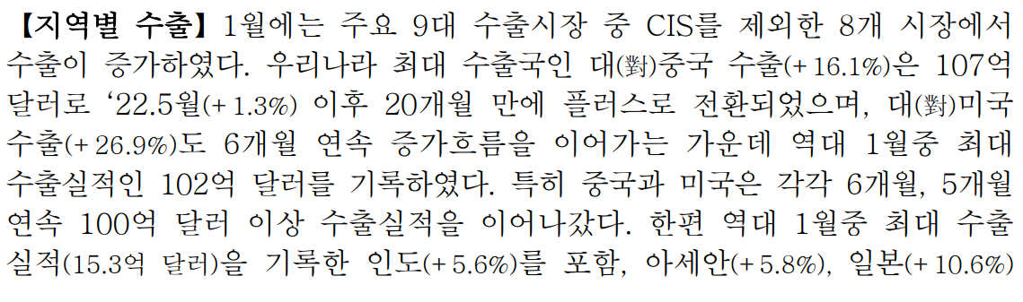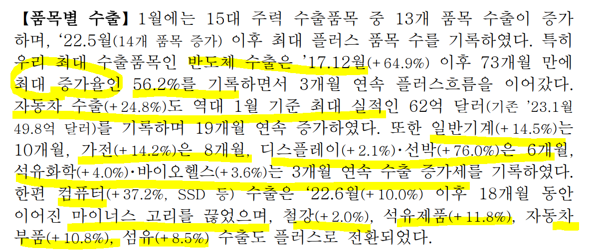 제일 중요한 부분은 수출액 증감률. 반도체의 상승폭이 두드러지고 일반기계, 자동차도 고무적이다. 자동차부품은 지난달엔 감소였던거 같은데 1월은 플러스로 바뀌었다.