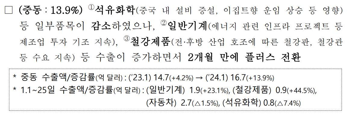 전반적으로 일반 기계쪽은 애매하고, 반도체는 대체로 좋은 흐름을 보여주고 있지만 중동은 반대로 일반기계와 철강이 좋았고 자동차와 석화 품목이 좋지 않았다.