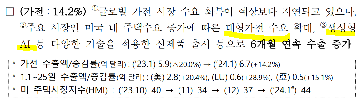 경기가 안좋아지면서 단박에 수출 데이터가 고꾸라졌던 가전이 드디어 반전을 하는데 여기에는 미국 내 주택 수요 증가에 따른 대형가전 수요 확대와 AI 기술이 도입된 신제품 출시로 판매가 촉진된 영향을 받았다. 가전제품도 인공지능 들어가니 잘팔리나 보네.