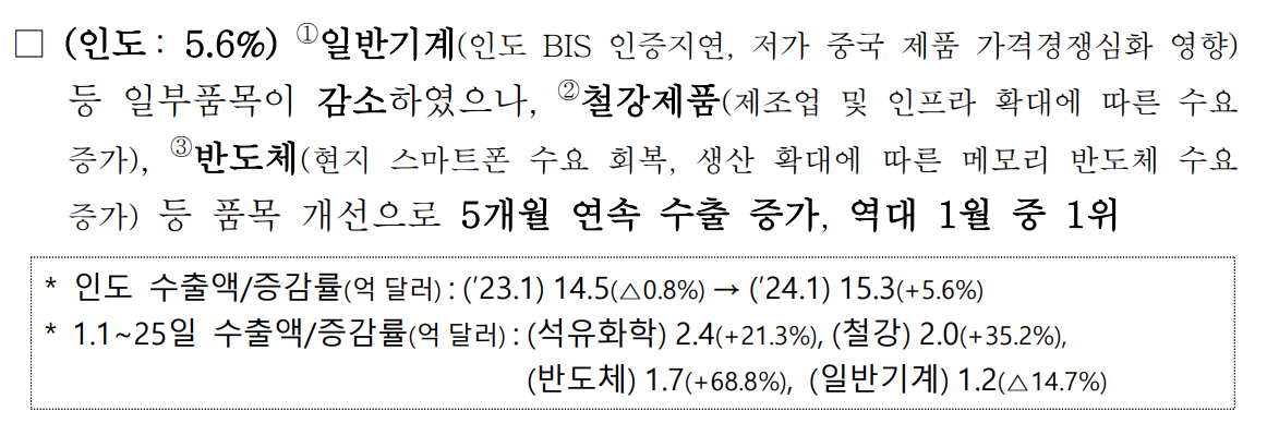 인도는 철강, 반도체 개선세가 뚜렷했다. 여기도 제조업과 인프라 투자에 적극적이다. 반도체는 스마트폰 수요회복이 된 부분이 보인다. 인도는 중국하고 사이가 안좋아서 중국산 스마트폰은 안쓰기 때문에..