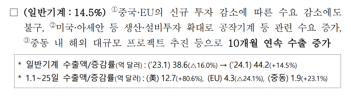 일반 기계는 중국과 유럽연합의 투자 감소에도 미국과 아세안의 설비투자 확대에 따른 공작기계 수요가 증가했다.