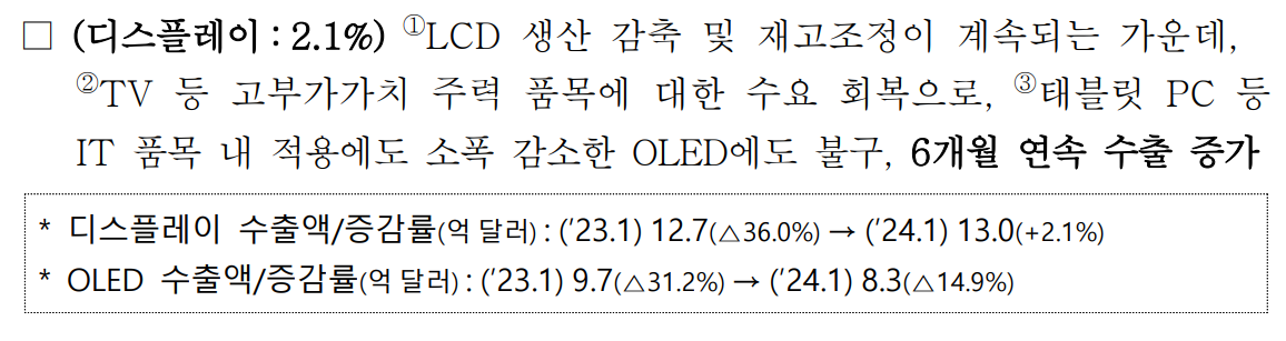 디스플레이는 LCD 감축이 이어지지만 TV 등 고부가가치 주력 품목의 수요로 6개월 연속 수출 증가를 달성했다.