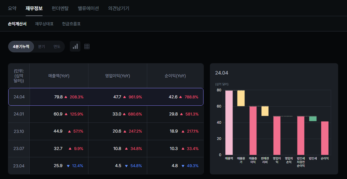 시총 1위를 달성한 엔비디아, 주가가 최근에 미친듯이 올랐지만 매출액과 영업이익, 순이익을 보면 왜 그렇게 올라갔는지 납득이 될 정도로 급격한 매출액 증가가 눈에 띈다.