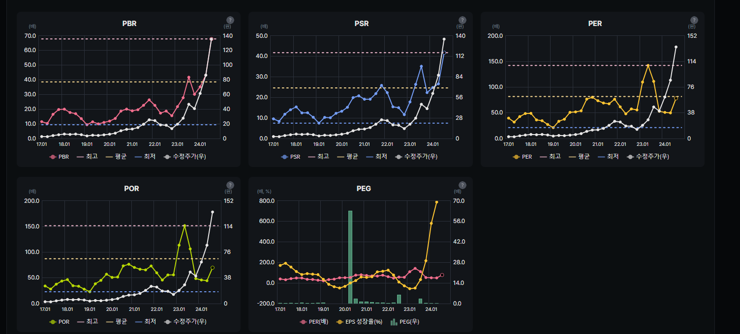 밴드차트를 포함한 밸류에이션 산정에 도움이 되는 상대지표들도 대부분 제공한다. POR, PSR은 네이버 증권에서도 없기 때문에 적자기업들 밸류에이션 메길때도 도움이 될 듯하다.
